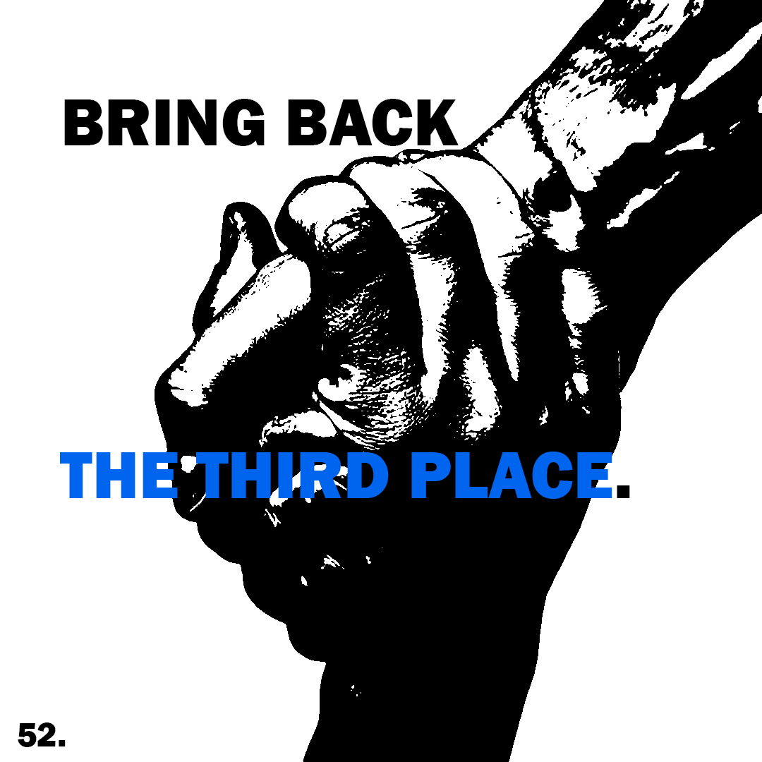 The artwork aims to visually embody my idea of humanizing the city through "third places" —spaces designed for relaxation and recreational activities beyond work or isolation at home. The interconnected hands signify camaraderie among city dwellers, particularly within the urban setting. The blue text was deliberately selected for its contrast with the underlying black text and the central black-and-white image, creating a visually striking composition.