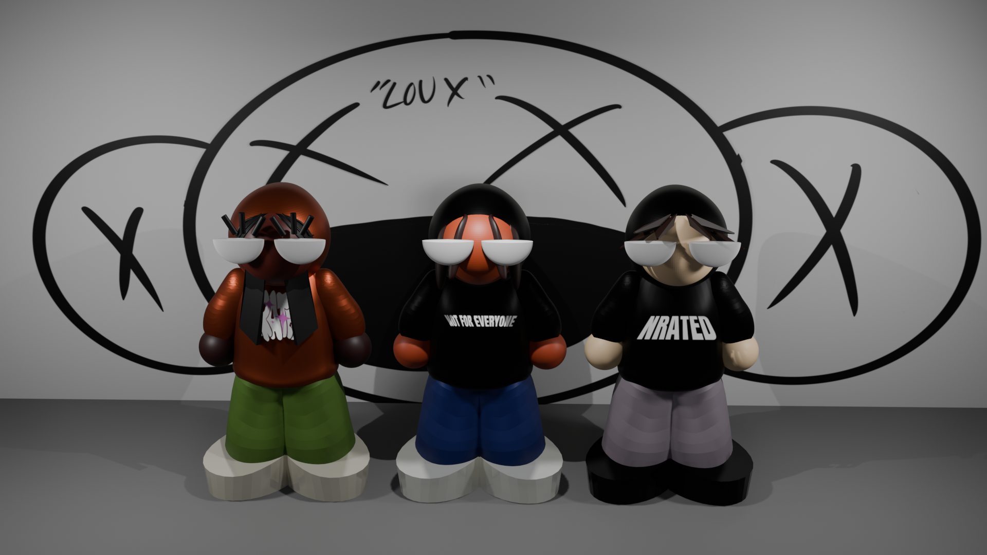 Among my creations, this piece stands out as one of the most distinctive. It showcases a novel technique I acquired using Blender, specifically 3D modeling and rendering. These figures, intended to display three characters wearing hoodie merchandise, were designed for the brand I worked for, NRATED. While everything was created in Blender, text and certain illustrations, such as the graphite mark in the background, were vectorized through Photoshop and then incorporated into the artworks.